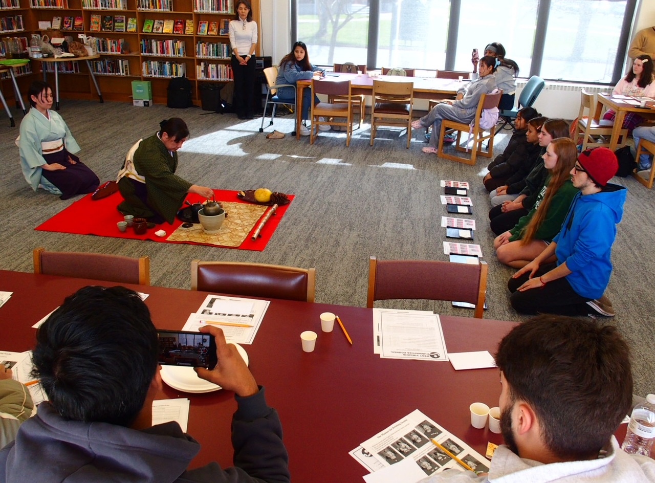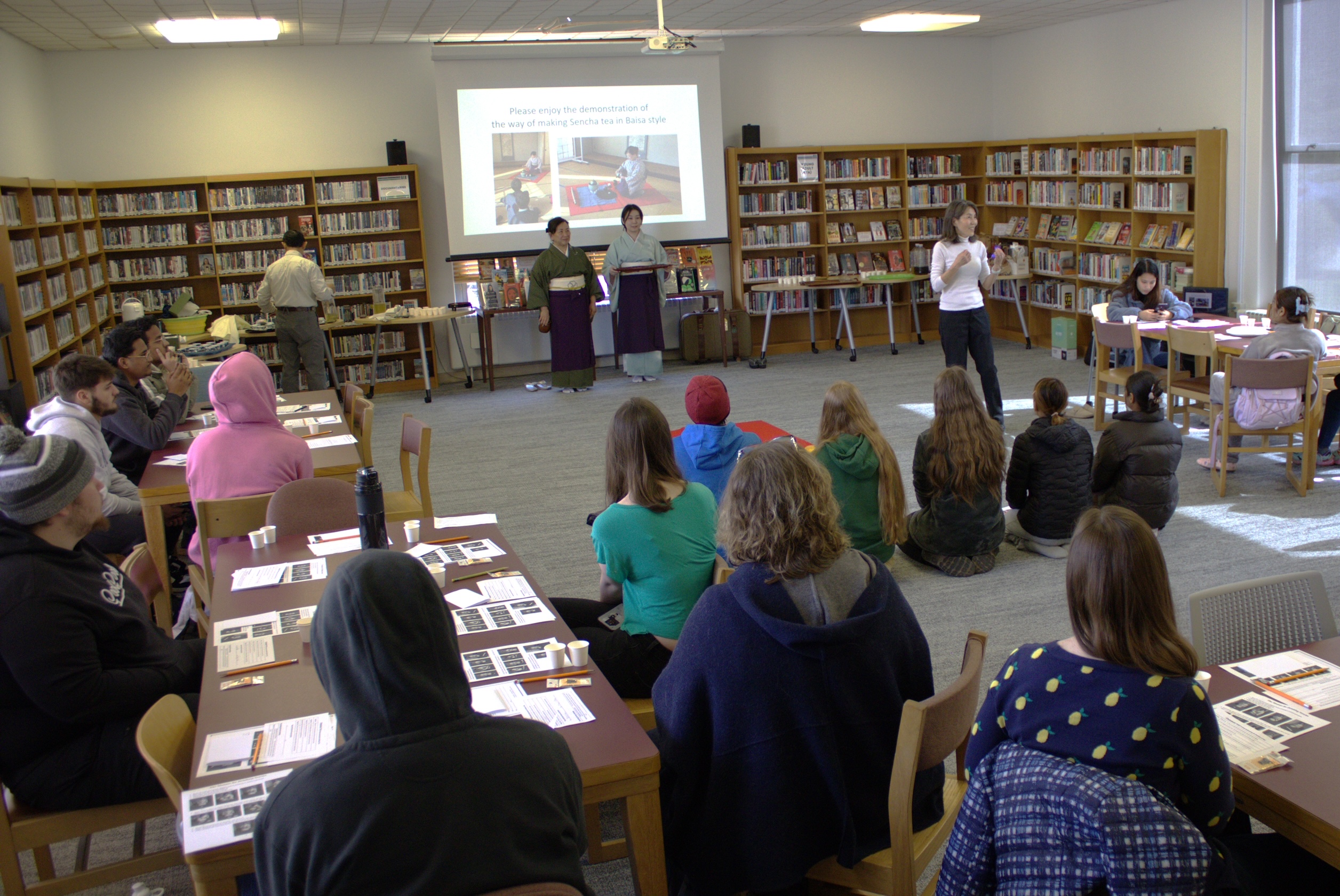 今回のテーマは「煎茶道を楽しむ」です。米国では、2014年にも煎茶道講座を行いました。11年前、米国中西部では、茶道といえば抹茶のみという状態で、煎茶道は全く周知されていませんでした。ですので、煎茶道を是非伝えたいとの一心で開催した講座でした。まず、お茶についての講義、次に3人一組で実際に急須でお茶を淹れる体験、最後に売茶棚のお点前を披露して、玉露を味わっていただきました。両州で最初に煎茶道を紹介できたことは、私の誇りとすることろです。