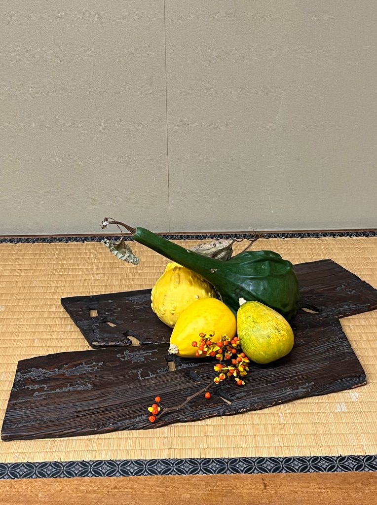 茶席は、旧暦の9月13日の「十三夜」の名月にちなんで、床には、大分日田の出身の田能村直入の月兎図に同郷の平野五岳の詩が添えられた掛幅がかけられ、砥部焼の白磁円筒の花器にサンザシと嵯峨菊が深まる秋を感じさせるものでした。茶具は、ぶどうもくの天然木が用意され野点の雰囲気を醸し出し、音羽乾亭による色絵の秋草図の涼炉、オランダデルフト製の月兎図の茗碗など、「十三夜」を堪能させていただきました。
