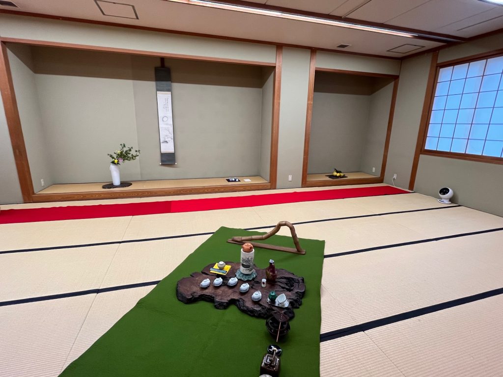 名古屋美術倶楽部2階西之間において 賣茶流の席が設けられました。寄付には、文人が琴棋書画を嗜んだから、土佐の徳弘太橆造の一弦琴と掛け軸に見立てた一弦琴の袋が掲げられ、袋には松永耳庵の讃と坂東貫山の西王母が描かれていました。煎茶の世界あふれる空間でした。