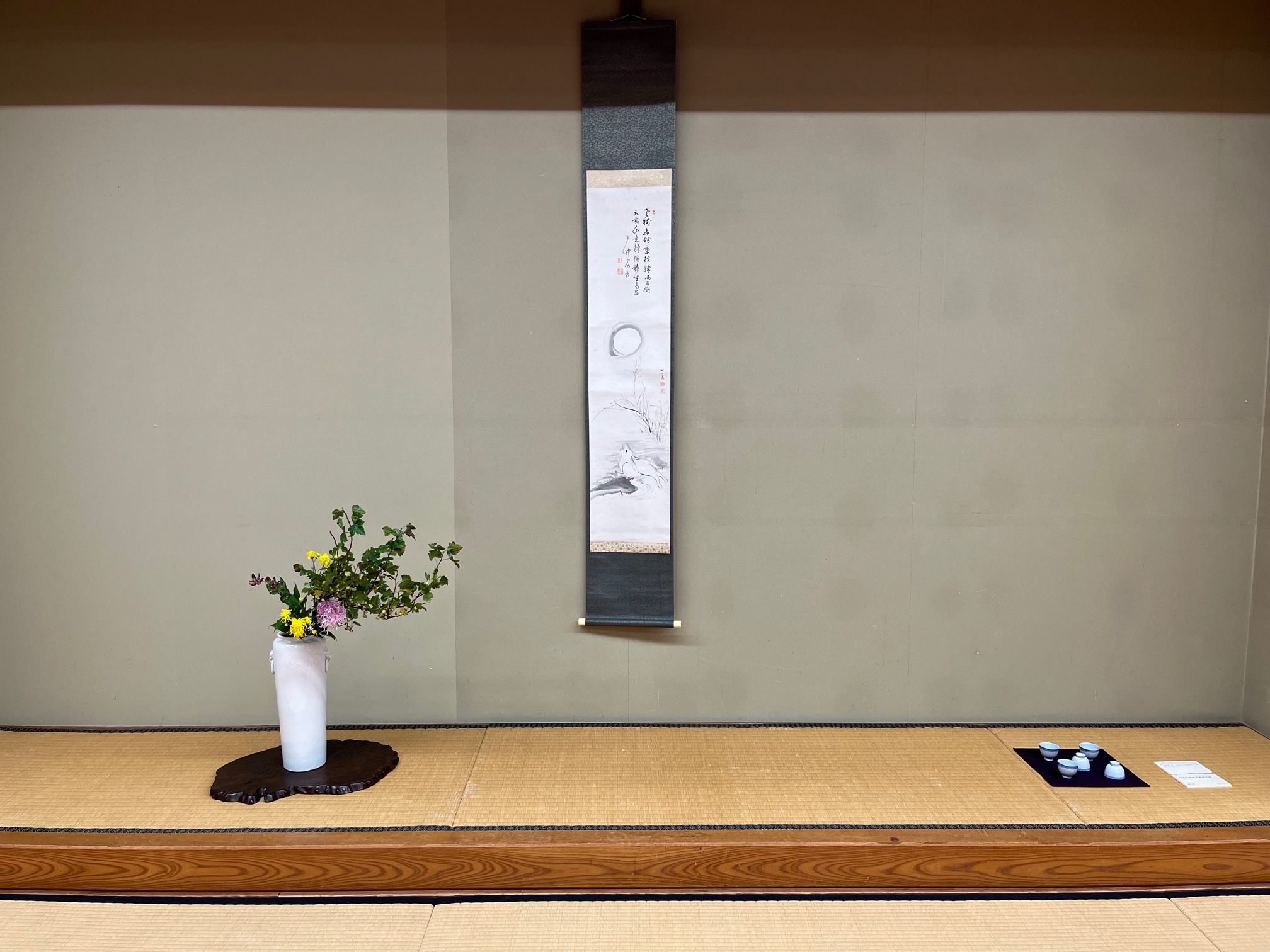 茶席は、旧暦の9月13日の「十三夜」の名月にちなんで、床には、大分日田の出身の田能村直入の月兎図に同郷の平野五岳の詩が添えられた掛幅がかけられ、砥部焼の白磁円筒の花器にサンザシと嵯峨菊が深まる秋を感じさせるものでした。茶具は、ぶどうもくの天然木が用意され野点の雰囲気を醸し出し、音羽乾亭による色絵の秋草図の涼炉、オランダデルフト製の月兎図の茗碗など、「十三夜」を堪能させていただきました。