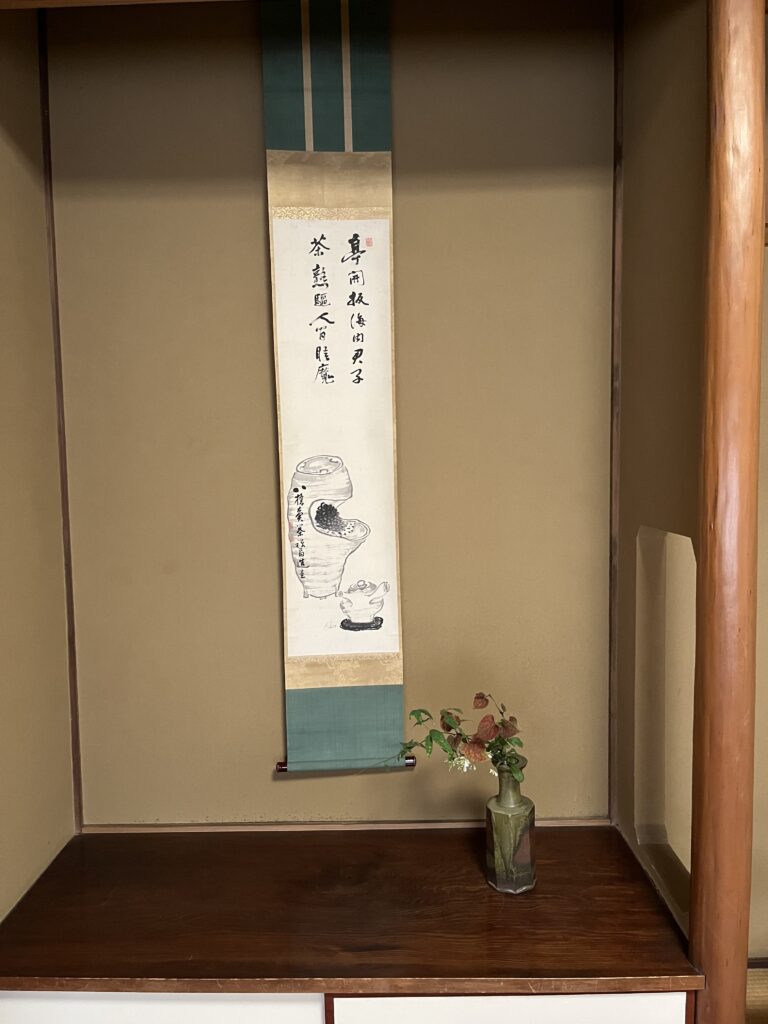 10月の売茶忌にて夕顔棚のお点前をさせて頂きました。先月の日月棚に続き、秋のお点前の一つで有田の豊増一雄さんのお道具揃えでした。お道具に関してのお家元の多彩なお話を伺いながら、和やかな雰囲気の中で終える事が出来ました。当日はオンライン配信されますので、自己流になっていないかを事前にお尋ねし、丁寧なお点前を心掛けました。