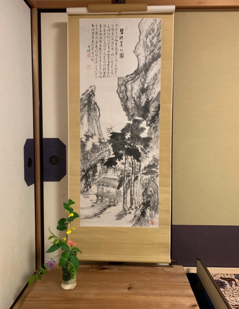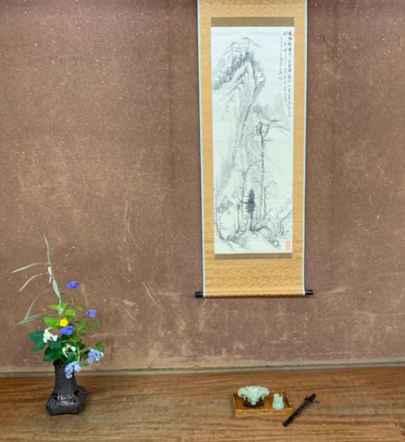 二間床には、大幅の田能村直入の「水墨山水図」と、山紫陽花で室礼しました。又、梶の葉蓋で涼しさを演出しました。