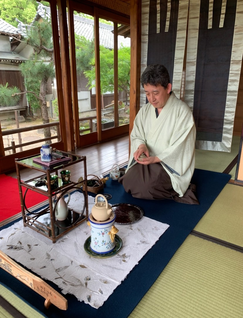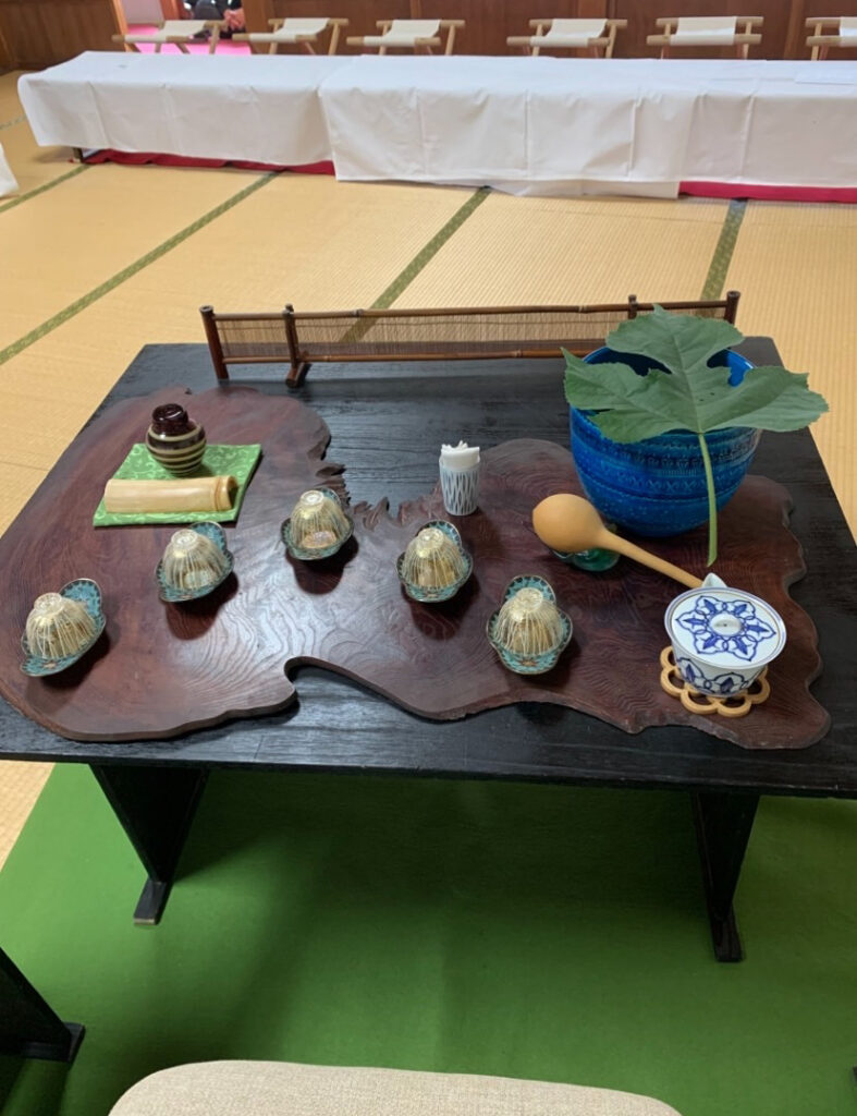 花しょうぶ茶会では、黄檗管長様のお軸で心引き締め、円窓棚で一煎差し上げました。又二日目の儀式殿会場では、立礼式の冷煎手前をいたしました。