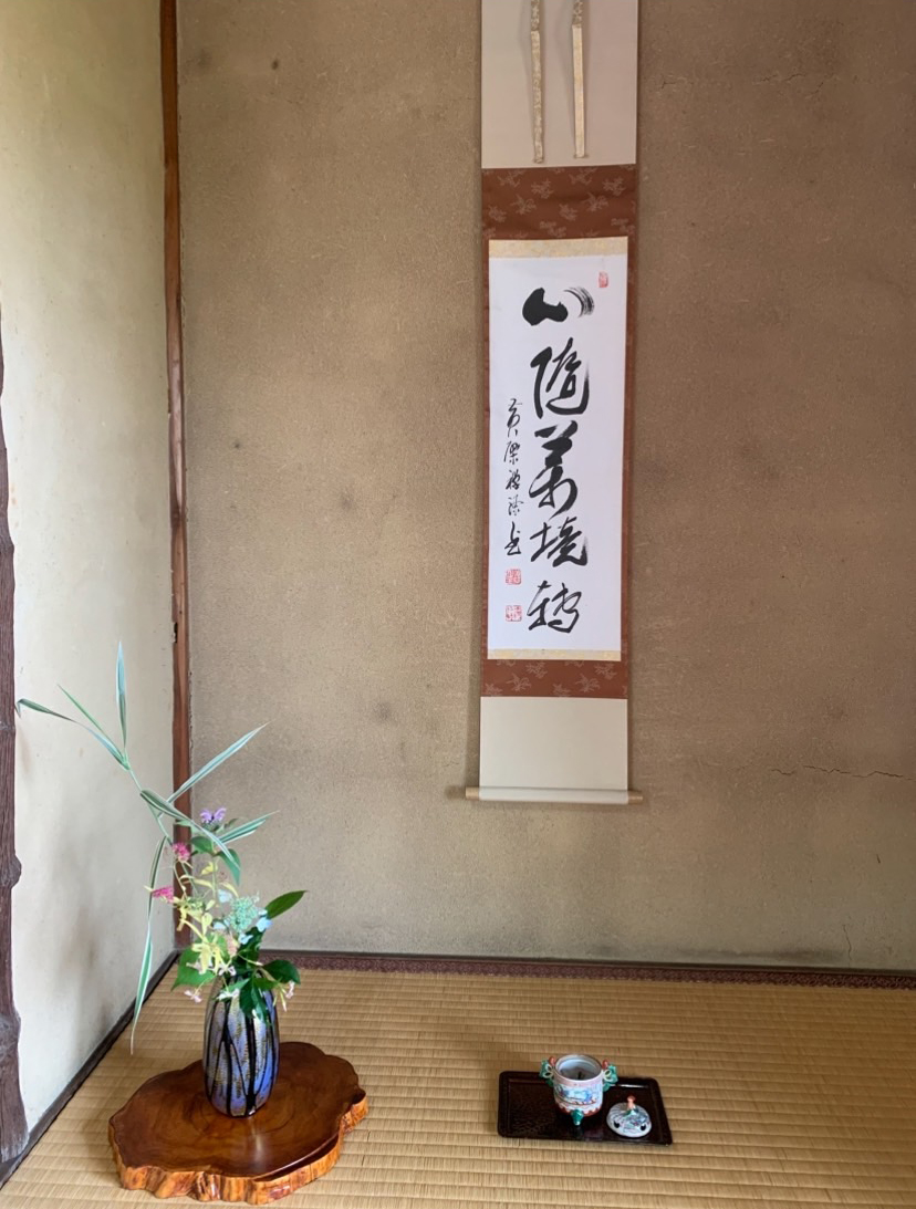 恒例のお茶会が始まりました。今年はかきつばたの紫の花が沢山咲き誇り、大勢の方々が無量寿寺庭園に来られました。私達は2日連続の担当になり、お席も大変賑わいました。美濃の南画家で村瀬雪峡の「碧梧翠竹図」を掛けた室礼に、「お煎茶の道具組がとても珍しく、可愛い」とお客さまは感嘆されていました。