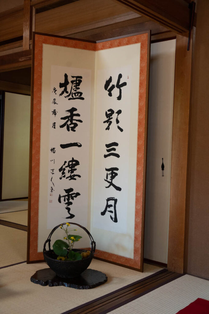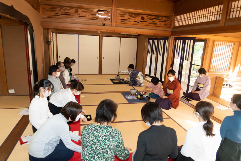秋空の広がる文化の日、親子発表会を行いました。ちょうど一昨日前の11月1日にジブリパークが開幕。室内のニ席は、ジブリの世界、二ノ国の茶具敷を使ったお茶席でした。ウイットに富んだ趣向に、子ども達の心も和んだことでしょう。
