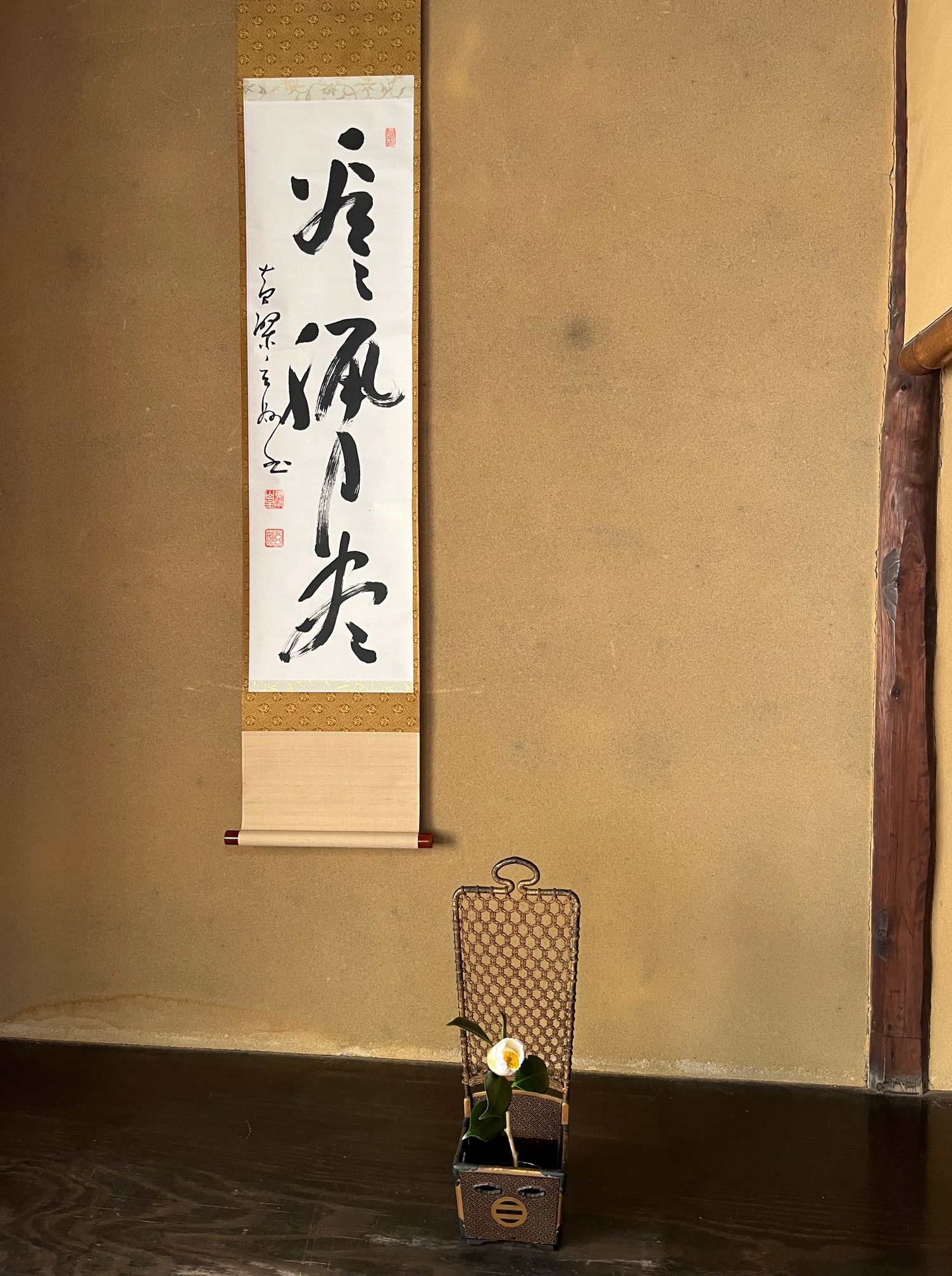 寒さ厳しき年の瀬、城山八幡宮の月次茶会が開催され、栄中日文化センタ-教室は、洗心軒二階にて煎茶席を担当させて頂きました。XYZ茶会、つまり「後がない」「今際の際」「死に際」という趣向のもと、室礼には様々な工夫が凝らされていました。