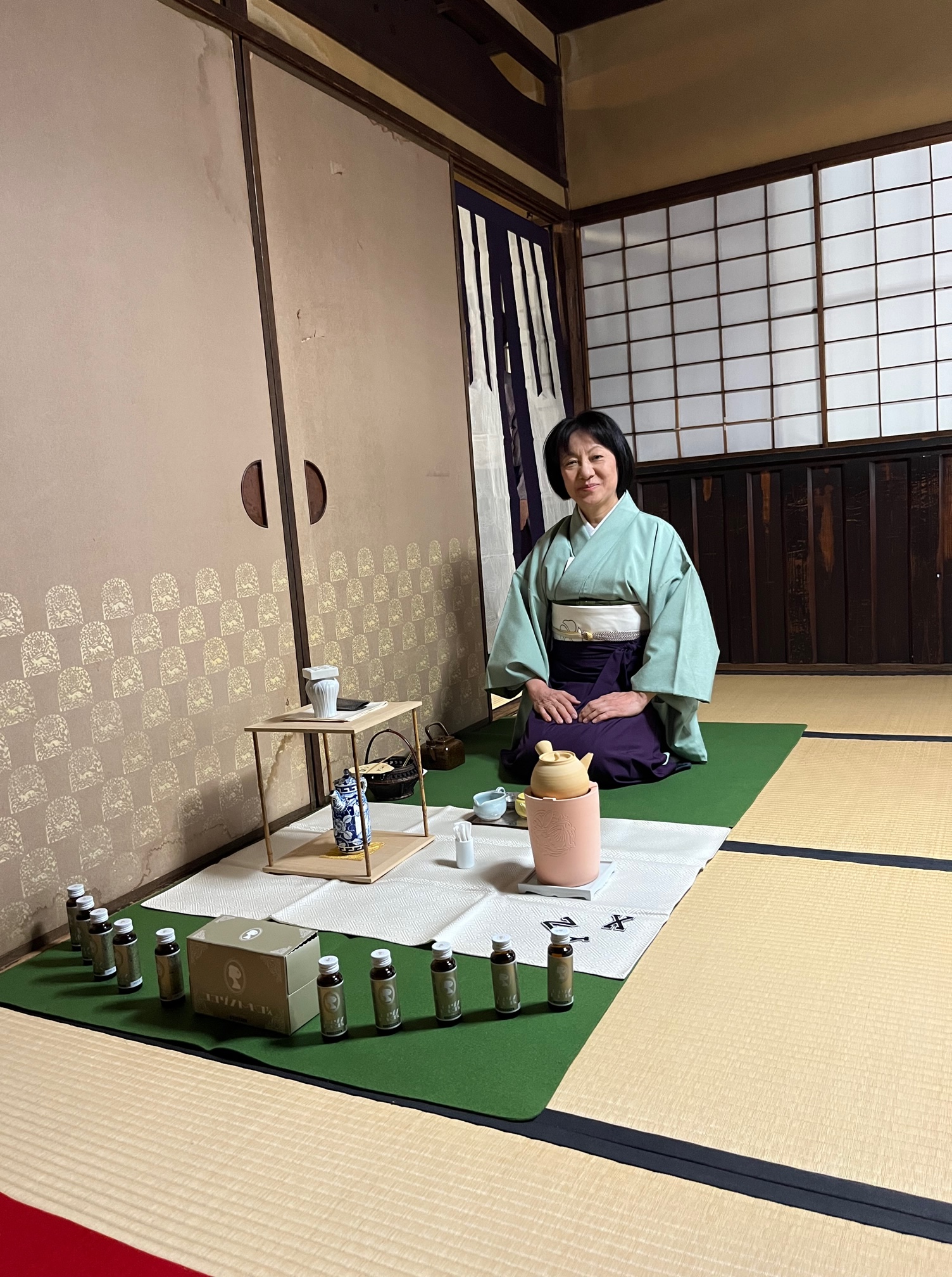 床の間には、箙(えびら)の花器に白い椿。今際の際のイメ-ジでしょうか。茶具は、白地の緞子の茶具敷の他、茶壺、袱紗、巾筒、銘碗などを白で統一し、白装束を彷彿とさせるものでした。目を引いたのは炉屏です。「輝きたいココゾの時にこの1本!」と言うキャッチフレーズの栄養ドリンク剤10本とその外箱を並べ、ココゾの時に助けになるようメッセージを込めたようです。