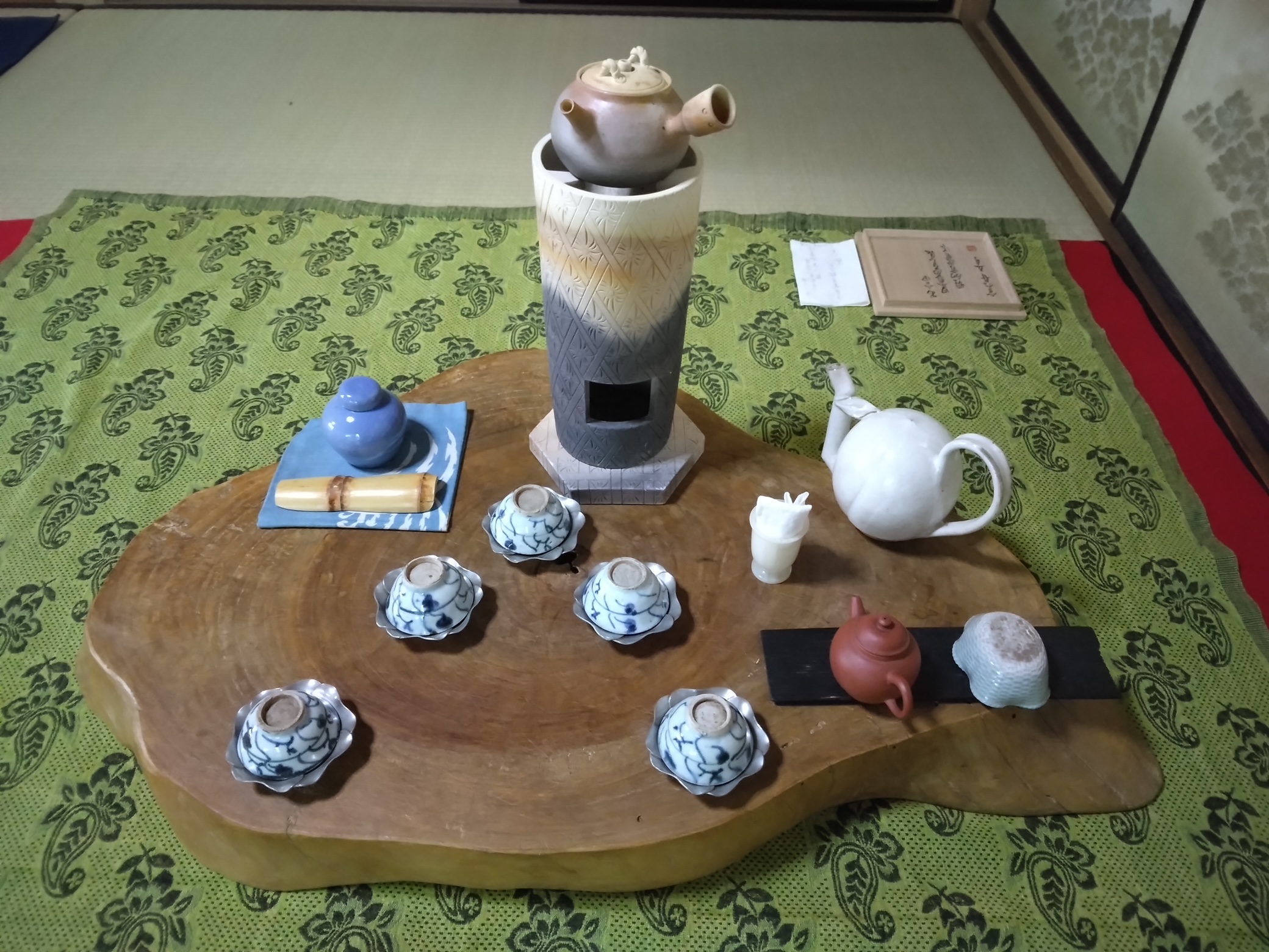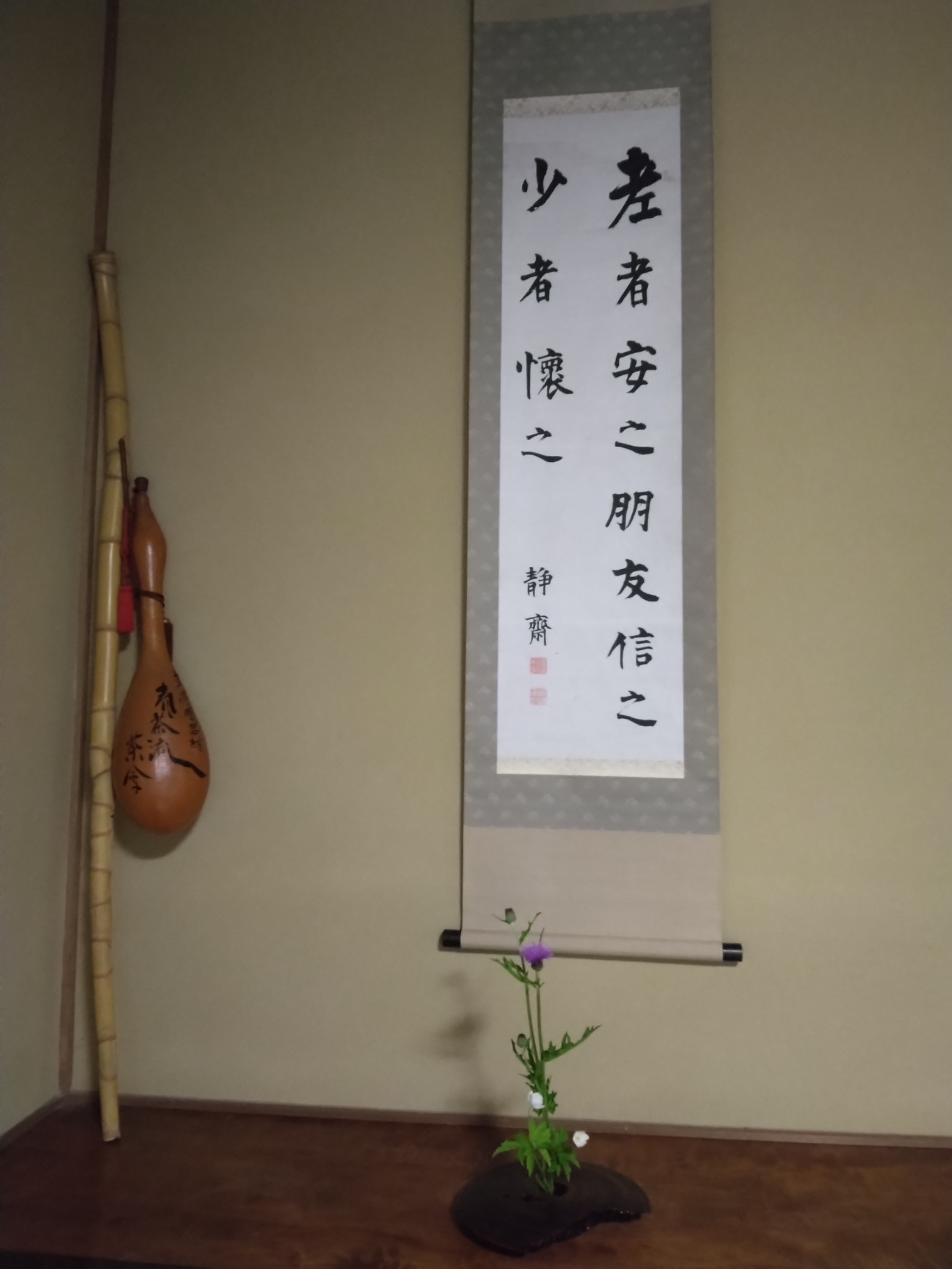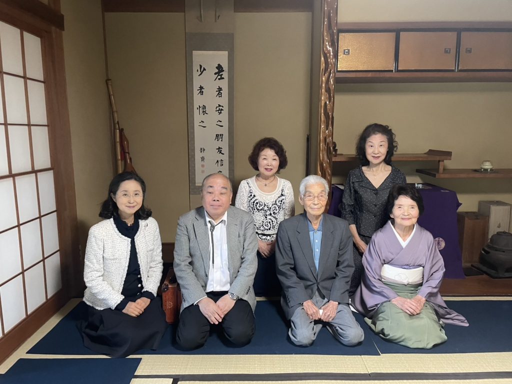 お掛け物は藤村のお父様の書、お花はヒナ桔梗とアザミ、お菓子はあや錦でした。藤村の書、敷地内の松で作られた点台、地元作家の竹の茶合や烏府など、旧家らいお道具の数々を拝見致しました。