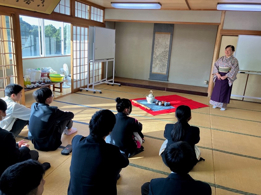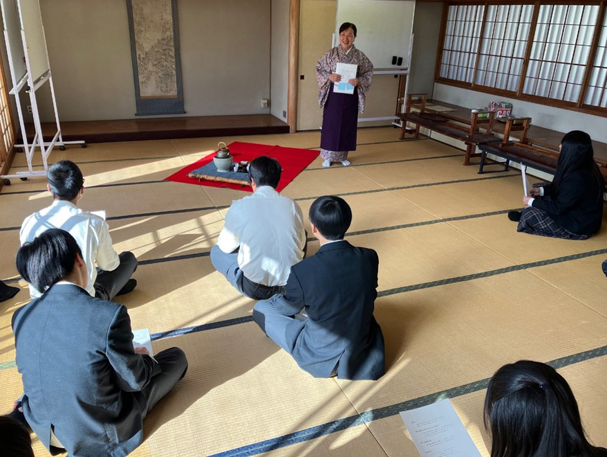 今回の授業は、和室での所作から始まり、お茶についての概説、日本茶飲み比べ、売茶流のお点前披露の流れで行いました。