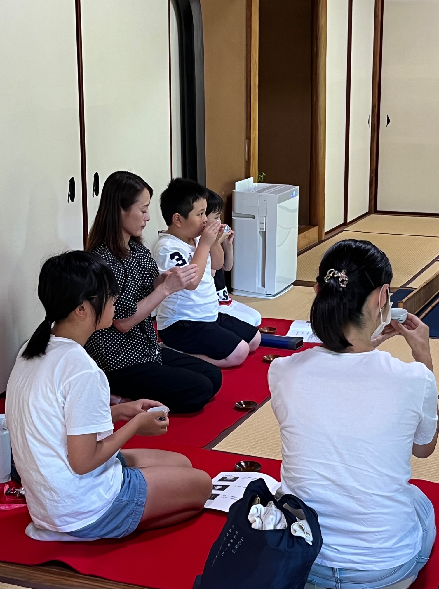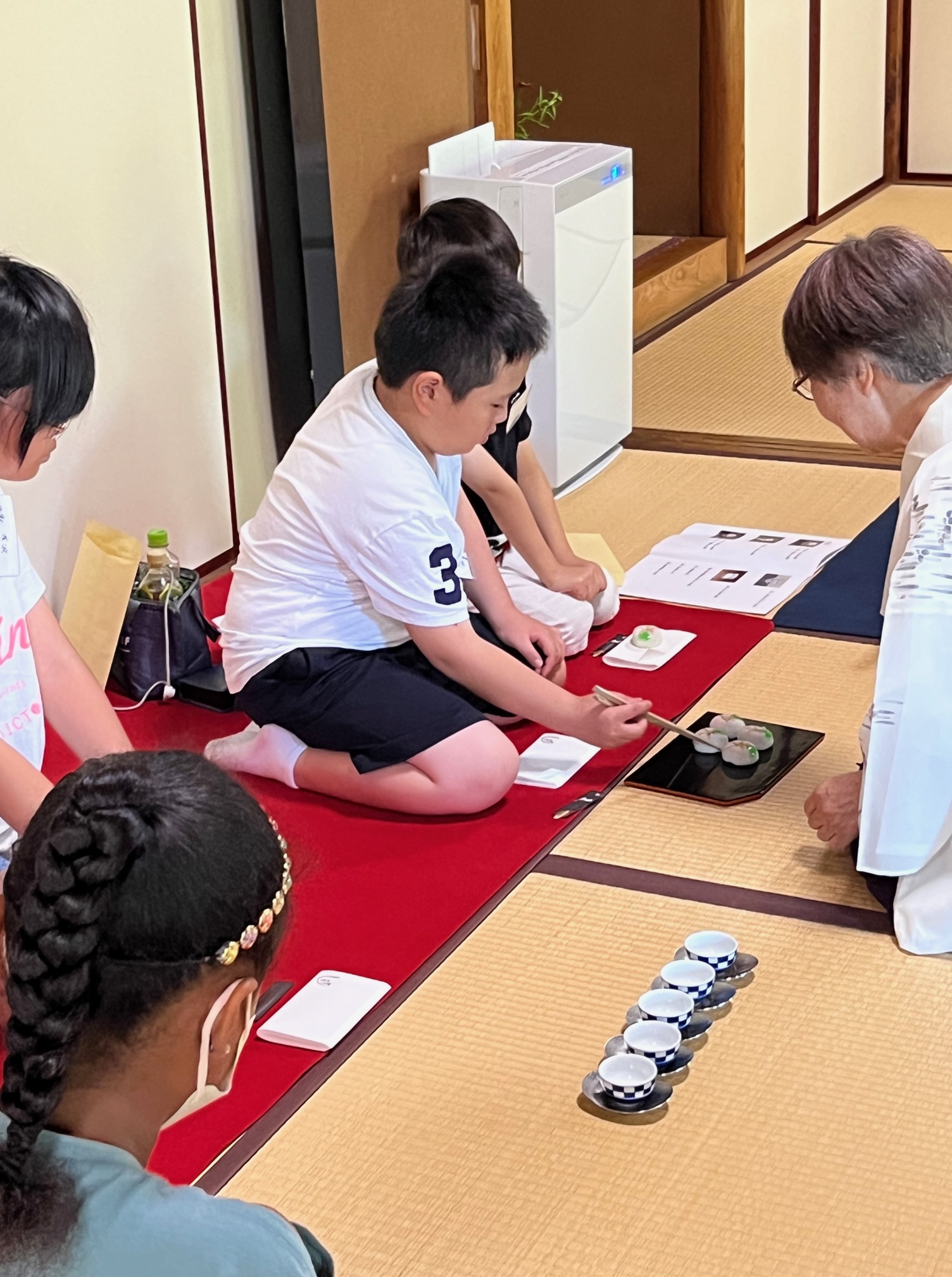 煎茶道ってなぁに、というところから、急須で淹れるお茶を体験していただだきました。お点前の冷煎のお茶をのみ、「冷たくておいし〜い。」「1煎目と2煎目と味がちがう。」などと声があがりました。