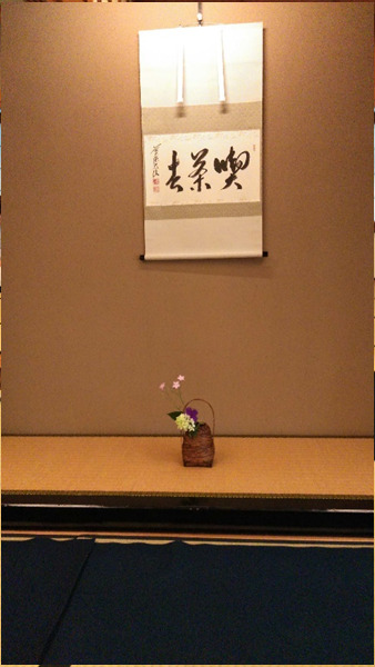 初回は茶会形式で、床の間の軸は「喫茶去」、篭花入に季節の花を飾り、玉露の冷煎、お菓子は「朝露」にしました。