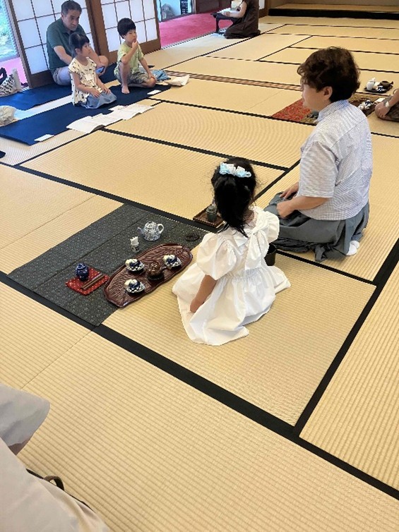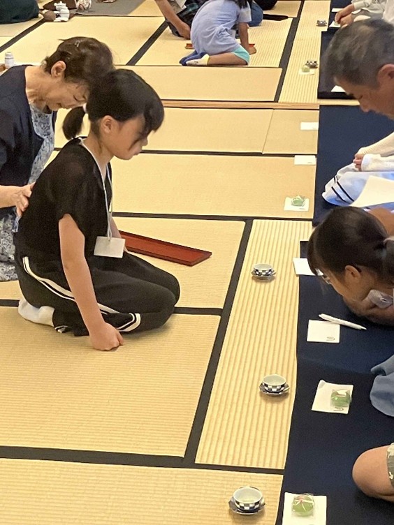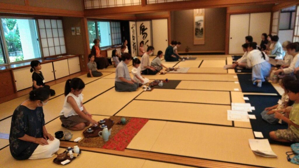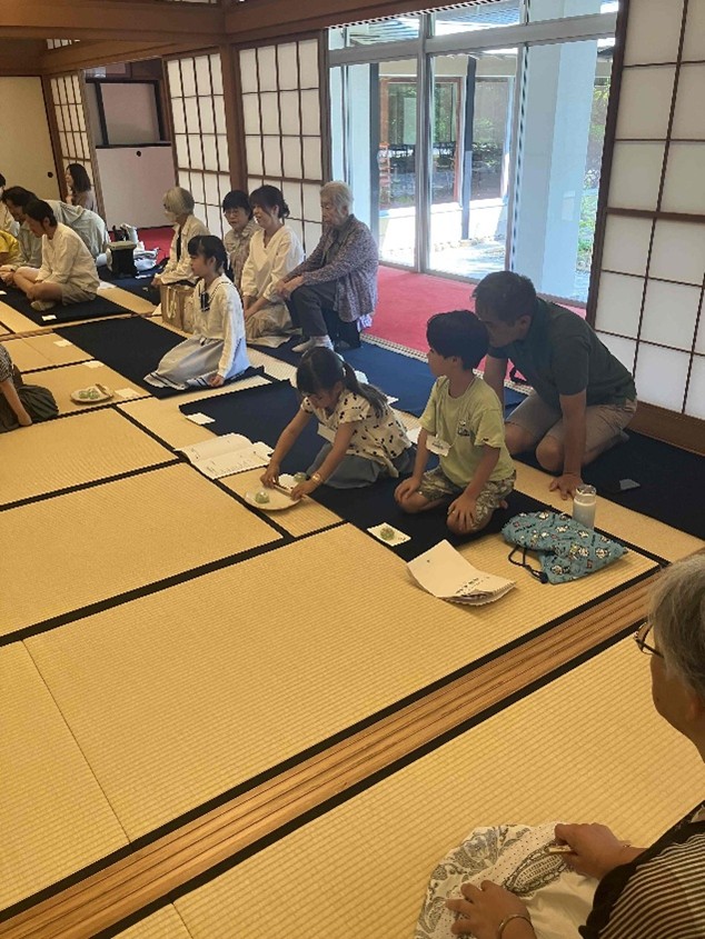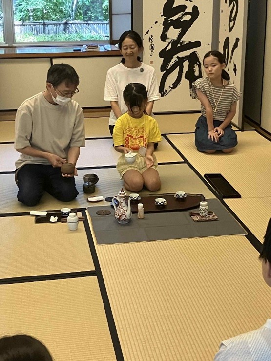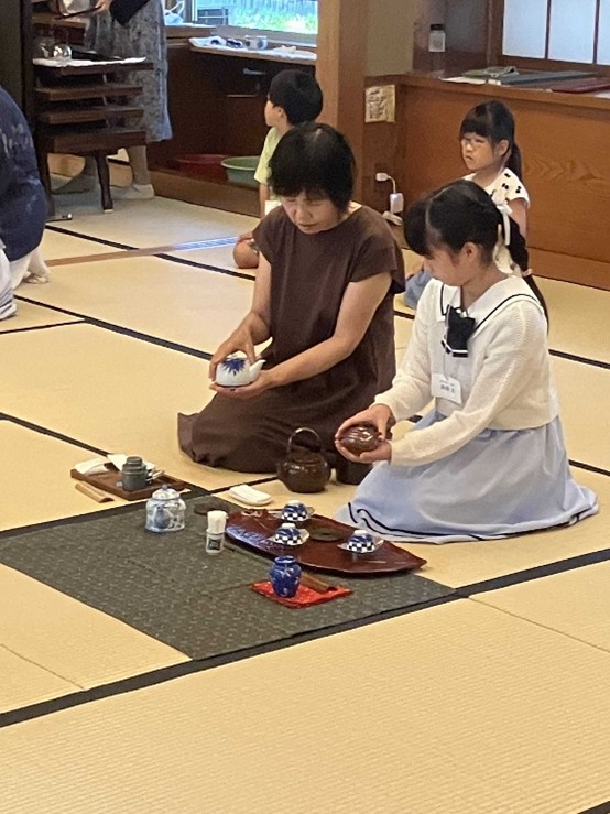 東三河支部第五回煎茶道親子教室 令和7年8月24日 2025年9月1日 最終更新日時 : 2025年9月1日 kouetusousha 今日はひ孫のお稽古姿を見たいと、祖母・曾祖母の方々が見学に来られました。皆さん、手前の姿勢・手さばきが綺麗になり、ご父兄の方も関心していました。 残暑は厳しいですが、お軸は初秋の気配を感じるように「山都風景」、深山に分け入り煎茶を喫するように、花は涼しさを感じるように初雪草、糸薄などを入れ、お菓子は水に浮かぶ睡蓮を表し「水面」としました。 煎茶の先生をやっておられた、曾おばあちゃんも大変喜んでくださいました。ひ孫さんが淹れた玉露は大変美味しかったそうです。