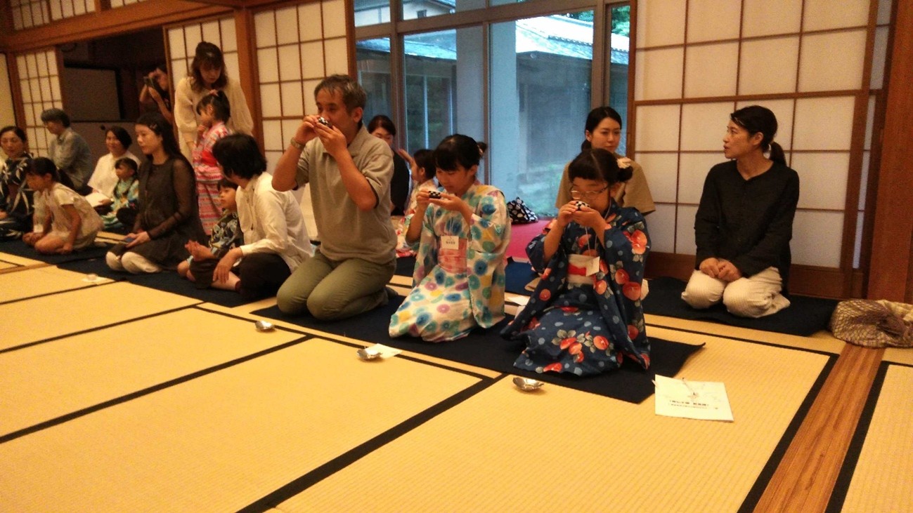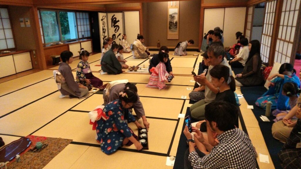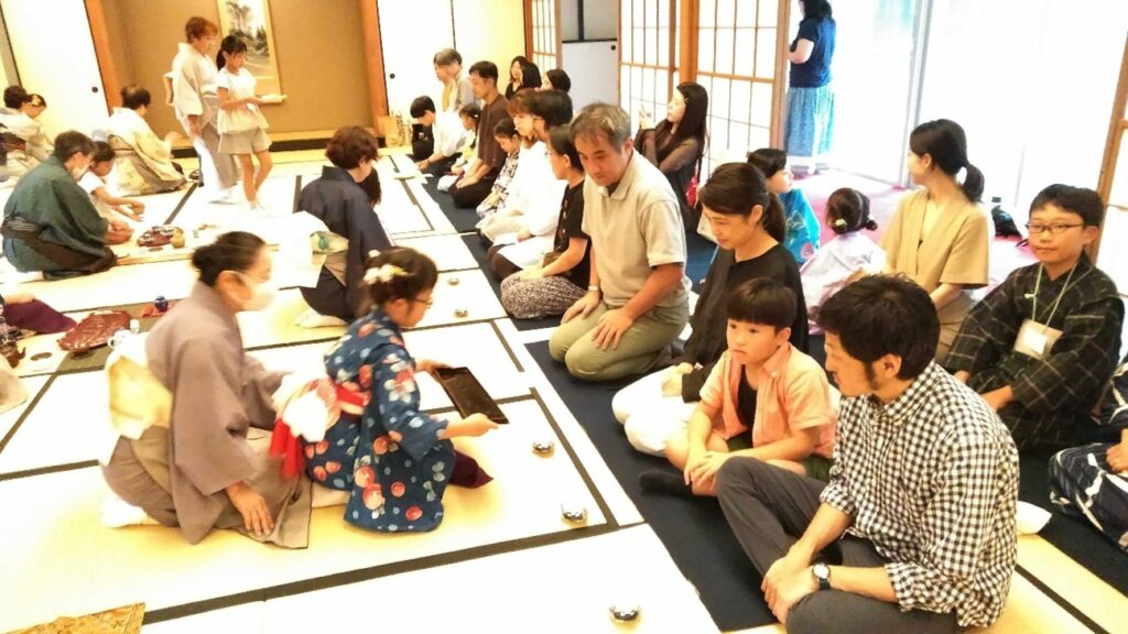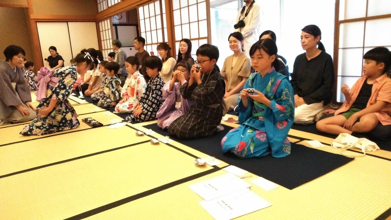 子どもたちには浴衣を着て、お手前、お運びを披露してもらい、保護者には客の作法をやってもらいました。