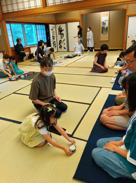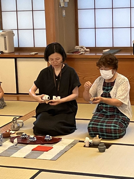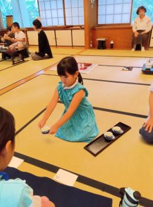 3回目のお稽古が始まりました。床の間には夏の山都風景のお軸をかけ、お菓子名はもうすぐ来るお盆にちなみ「ほおずき」としました。希望者には2回お手前をしてもらいました。