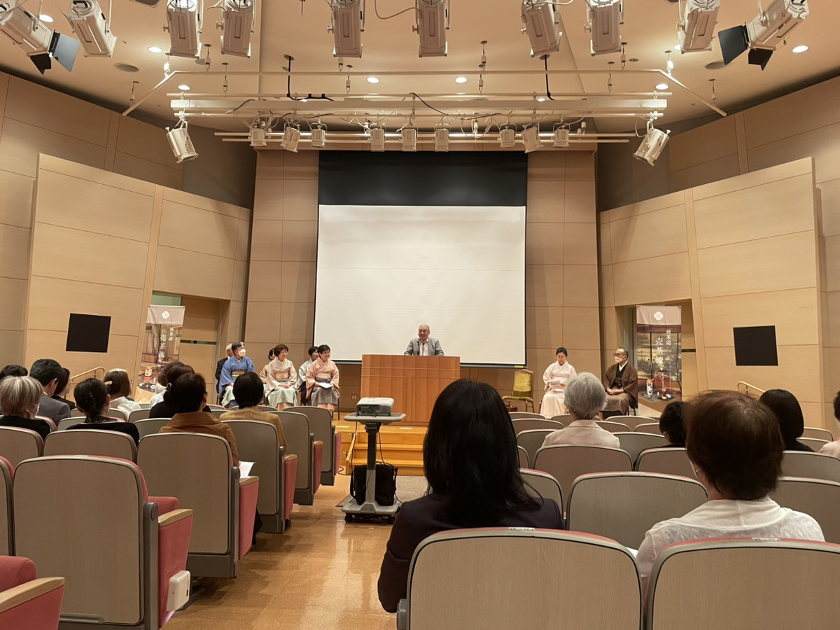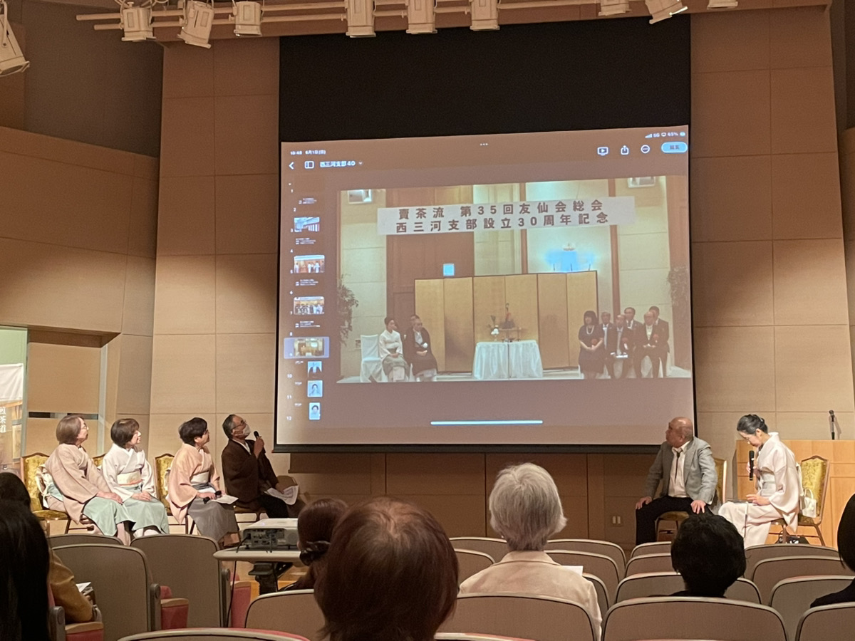 まず、小ホールにて、会計報告、新役員紹介など総会を行いました。その後「40年を振り返りかえって」をテーマに、宗匠主導にて、4名の先生方が舞台に上がり、歴代支部長さんの写真など懐かしいスライドを見ながら、ディスカッション形式で進みました。色々なお話が出て、会員の皆さんも楽しく聞いておられました。