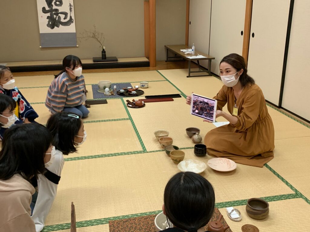 陶芸作家でもある河合里奈さんに焼き物の陶器 、磁器の違い、その産地からの身近な常滑焼にむすびつくお話などを実物の器を見て、触って、iPadも使って丁寧に していただき、子どもたちも乗り出して興味深い目をしておりました。