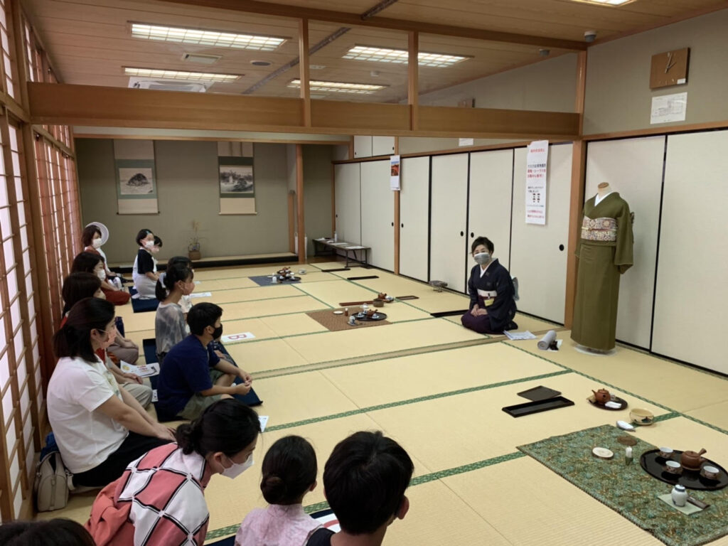 畑中社中で着付講師でもある間瀬桂子さんにお茶会にあう着物のモデルを傍におもてなしとしての装いお客様として装いなどこども向けのお話をしていただきました。