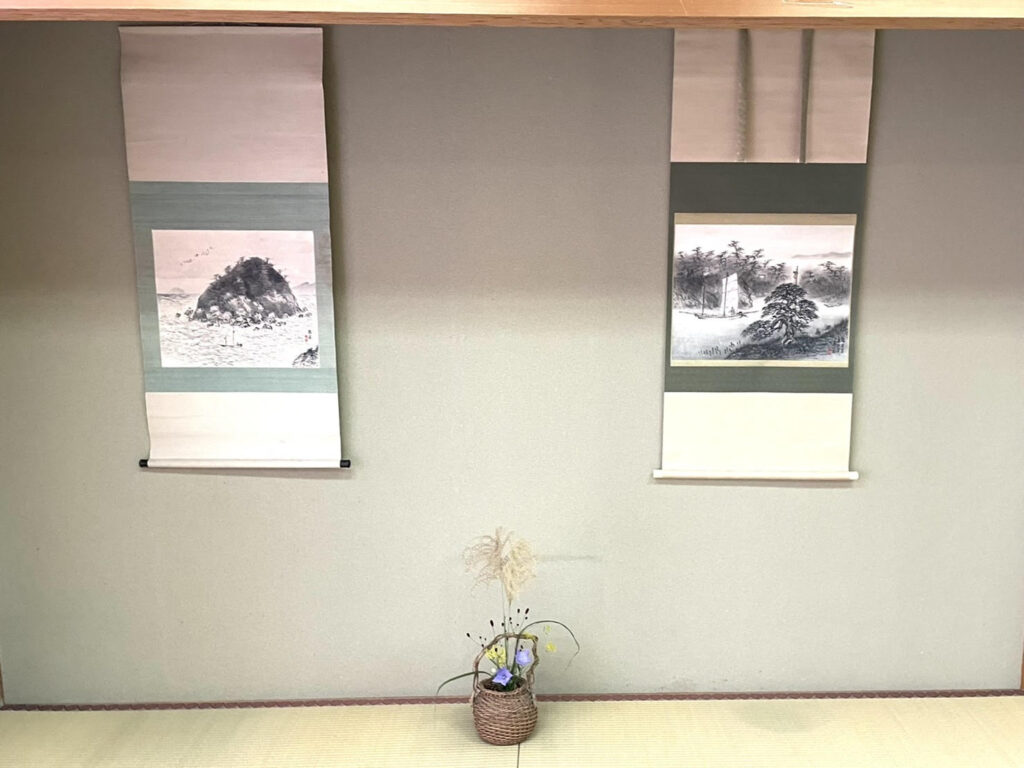 今回は私たち知多半島に居住する者として誇りをもてるよう近くの離島「篠島」「日間賀島」の 江戸時代の様子が描かれた対幅を掛けさせていただきました。