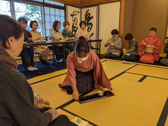 豊橋文化財団月釜 令和8年2月1日 2026年2月21日 最終更新日時 : 2026年2月21日 kouetusousha 寄付は一枝の紅梅の絵に神農像、ゆず湯で口を湿らせて本席へ。 2月5日が八橋売茶翁の命日なので床の間は八橋売茶翁筆の軸をかけ、青磁の花入れに白梅を入れ、立春も近いのでお菓子は「蕗の薹」また春節にあわせて東雲棚の手前としました。 最終席は(初めての茶会)で伝統親子文化教室の子供たちが参加してくれました。今回もわざわざ名古屋からお客様がみえたので正客に座ってもらいました。寒い一日でしたが、ほっこりした煎茶席になりました。